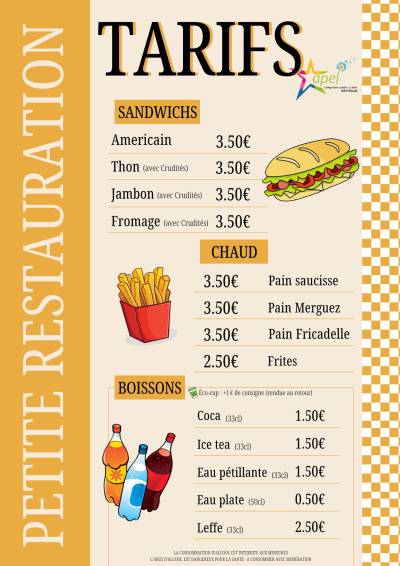 Les boissons sont servies avec des écocups consignées. La consigne est prise au stand tickets et restituée en espèces au stand restauration APEL lors du retour de l’écocup.
