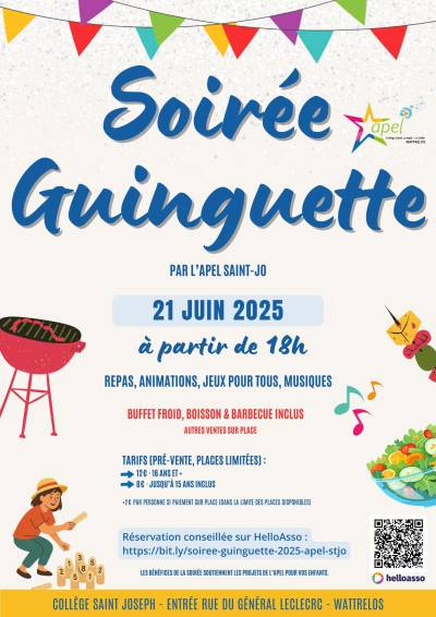 La Soirée Guinguette est le grand temps convivial de fin d’année de l’APEL. Son objectif est simple : rassembler les familles, les jeunes, l’équipe éducative et les bénévoles dans une ambiance chaleureuse, musicale et détendue, pour clôturer l’année scolaire en beauté.